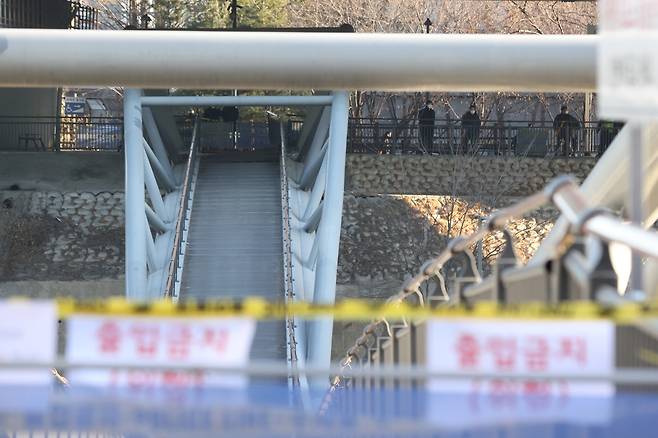 (서울=연합뉴스) 강민지 기자 = 3일 오전 서울 영등포구 도림동과 신도림역을 잇는 도림보도육교가 내려앉아 진입이 통제되고 있다.