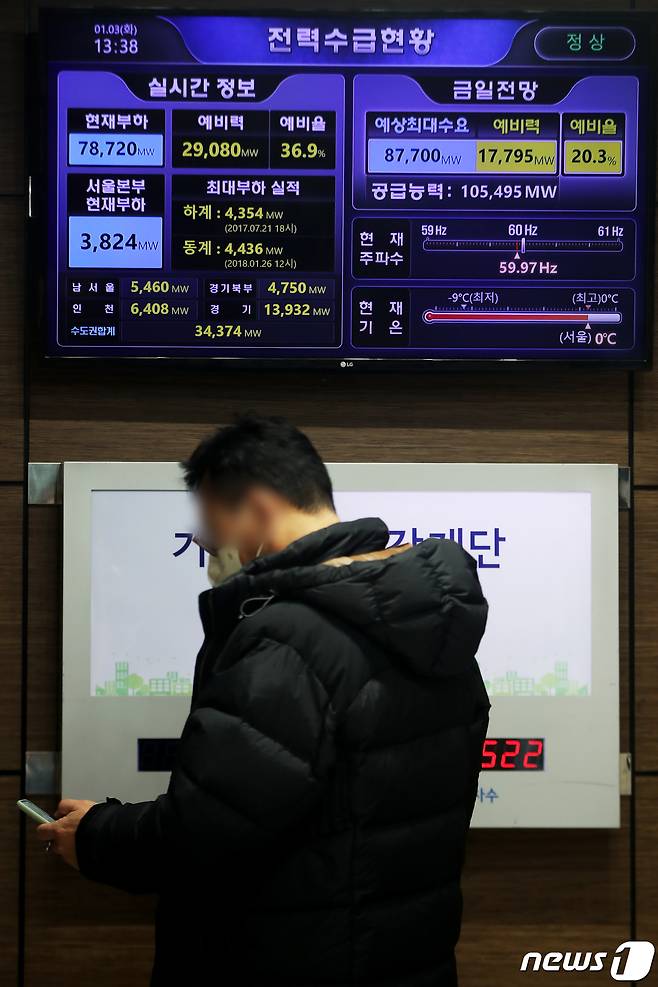 (서울=뉴스1) 황기선 기자 = 3일 서울 중구 한국전력공사 서울본부에 설치된 모니터에 전력수급현황이 나타나고 있다.