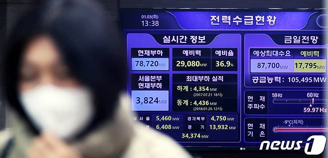 (서울=뉴스1) 황기선 기자 = 3일 서울 중구 한국전력공사 서울본부에 설치된 모니터에 전력수급현황이 나타나고 있다.