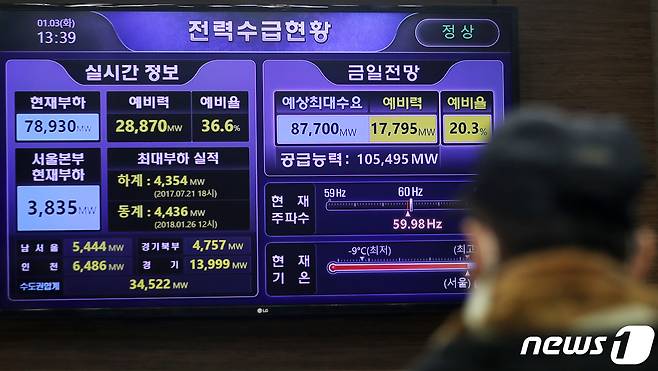 (서울=뉴스1) 황기선 기자 = 3일 서울 중구 한국전력공사 서울본부에 설치된 모니터에 전력수급현황이 나타나고 있다.