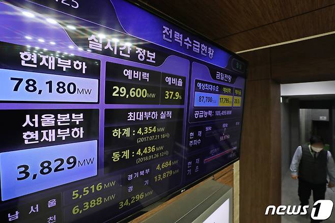 (서울=뉴스1) 황기선 기자 = 3일 서울 중구 한국전력공사 서울본부에 설치된 모니터에 전력수급현황이 나타나고 있다.