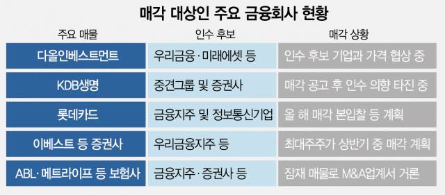 4대 금융지주 중 우리·하나 등 두 곳이 M&A에 적극적 의지를 보이고 있을 뿐 아니라 롯데카드·KDB생명·다올인베스트먼트(298870)·메리츠자산운용 등 매물들도 새 주인을 맞을 준비를 본격화하고 있기 때문이다.