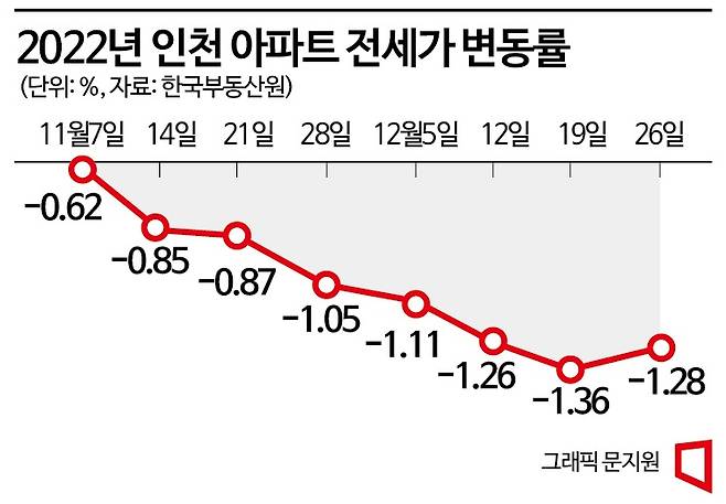 인천의 전셋값도 일제히 하락하고 있다. 한국부동산원이 발표한 주간 아파트 가격동향(26일 기준)에 따르면 인천의 아파트 전세가격 변동률은 -1.28%를 기록했다.