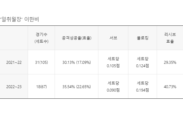 팀은 어려웠지만, 이한비 개인 기량은 일취월장했다. 지난 시즌 대비 올 시즌 공격성공률은 5%포인트 이상 오르며 리그 10위(35.5%)에 진입했고, 리시브 효율은 무려 10%포인트 이상 수직 상승해 수비 부문 8위를 기록 중이다. 지난해부터 본격적으로 선보인 스파이크 서브도 시즌 초엔 조금 흔들렸지만, 최근엔 조금씩 위력을 더한다. 이한비는 “주변에서 좋은 말씀 많이 해 주시지만 개인적으로는 여전히 부족하다. 배울 게 많은 선수다”라고 몸을 낮췄다. 그러면서 “배구는 팀 스포츠다. 개인 성적이 좋아도 팀이 패할 수 있고, 내가 잘 못해도 승리할 수 있다. 그래서 사실 개인 기록을 잘 챙겨 보진 않는다”라며 “다만 내 수치가 올라서 팀이 승리한다면 욕심을 더 내겠다”라며 웃었다.