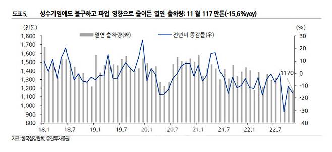 이유진 유진투자증권 연구원은 이날 보고서에서 “현대제철의 4분기 연결 기준 매출액은 5조8000억원, 영업이익은 278억원으로 전망한다”며 “실적 둔화는 현대제철 내 부분 파업으로 인한 생산량 감소와 11~12월에 16일 간 걸쳐 발생된 화물 연대 파업으로 인한 출하량 차질이 크게 작용했다”고 설명했다.