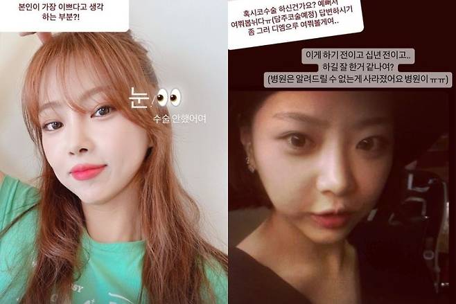 그는 "본인이 가장 이쁘다고 생각하는 부분"에 대해 "눈! 수술 안했어여"라고 답해 시선을 끌었다. 코 성형에 대해서는 하기 전 사진도 공개, "하긴 잘 한 거 같나요?"라고 묻는 등 쿨한 매력을 자랑했다.