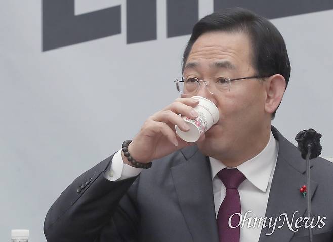 | ▲ 주호영 국민의힘 원내대표가 6일 서울 여의도 국회에서 열린 원내대책회의에서 발언을 마친 뒤 목을 축이고 있다. |
