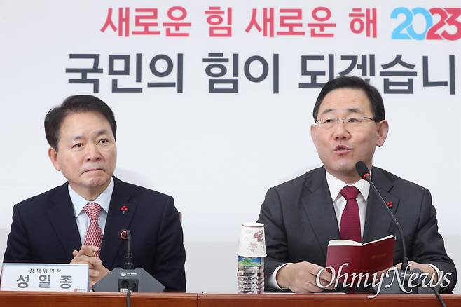 | ▲ 주호영 국민의힘 원내대표가 5일 서울 여의도 국회에서 열린 비상대책위원회에서 발언하고 있다. 왼쪽은 성일종 정책위의장. |