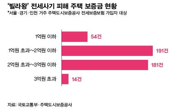 빌라왕 피해자 가운데 전세보증금 반환보증보험에 가입하지 않은 525명(46%)은 더 큰 문제다. 경매로 보증금을 건져야 한다. 김씨와 계약한 세입자들의 전세가가 대체로 집값에 육박하거나 더 높고, 경매로 넘어가더라도 시세의 70~80% 수준인 낙찰가율을 고려하면 사실상 전세보증금을 모두 건지기 어렵다. 낙찰되더라도 김씨가 체납한 종합부동산세가 먼저 징수되기 때문에 세입자들이 받는 보증금 액수는 더 줄어든다.