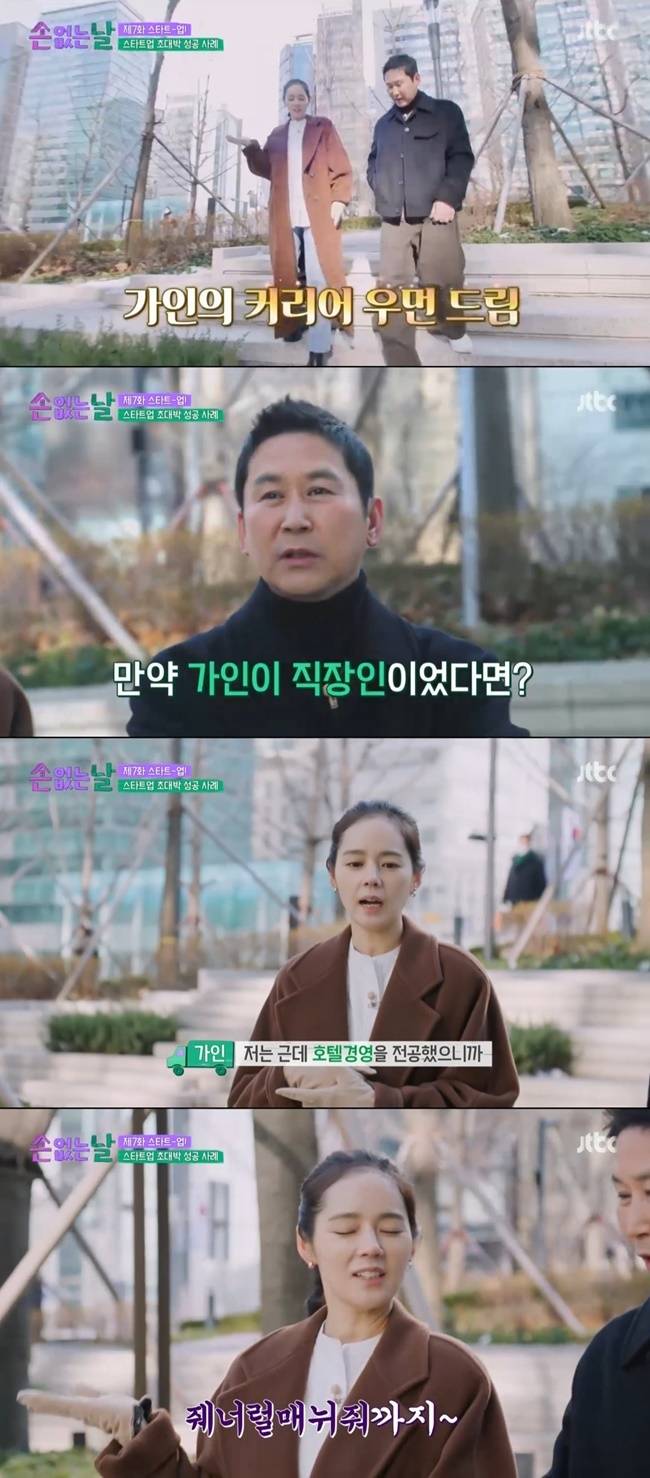 신동엽이 "어떤 회사에 취직했을 것 같나"라고 묻자 한가인은 "호텔경영을 전공했으니까 대학을 그대로 다녔다면 호텔리어가 됐을 것 같다"고 말했다.