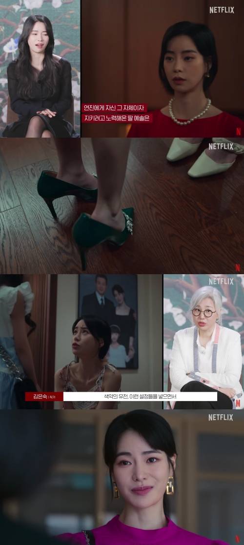 6일 오후 공개된 넷플릭스 코리아 '더 글로리' 코멘터리 영상에서 임지연과 김은숙 작가는 초록색 구두에 얽힌 비화를 전했다.