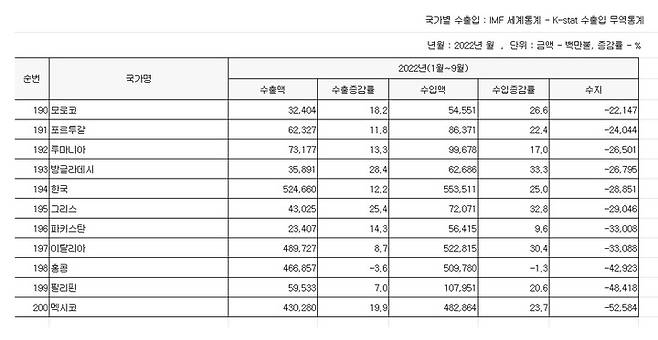 무역협회의 국가별 수출입 통계를 살펴봤습니다. 무협에 따르면 지난해 1~9월까지 전 세계 208개국의 무역수지 순위에서 우리나라는 무려 194위를 기록했습니다.