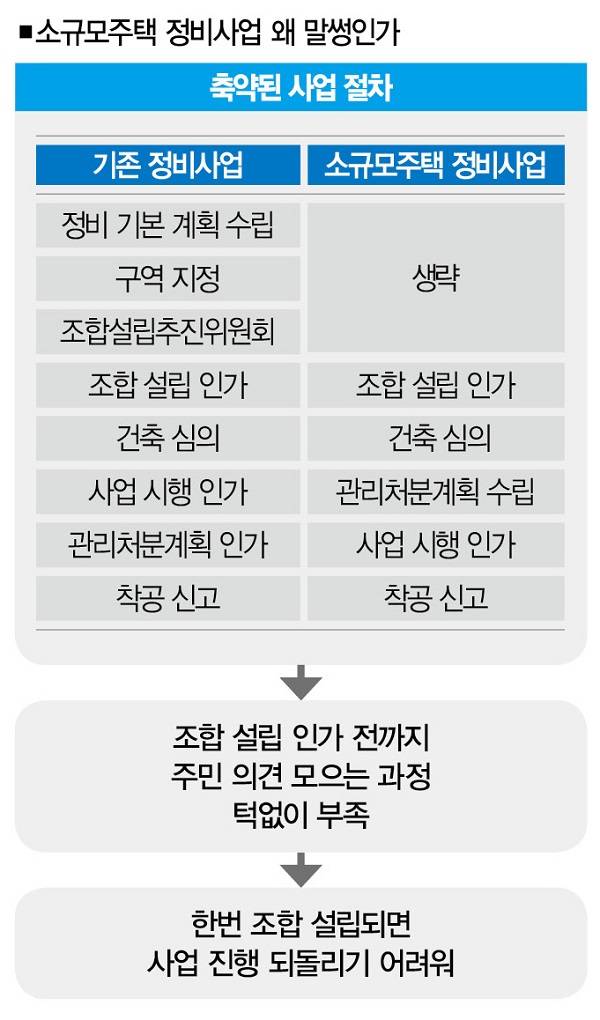 정비 사업의 방향을 두고 치열한 논의나 논쟁이 벌어져야 할 '공론화 과정'을 거칠 필요도 없다. 대규모 재건축ㆍ재개발 사업과 달리 소규모주택정비특례법은 주민설명회나 공청회를 강제하지 않고 있다. 허황된 미래 시나리오로 주민으로부터 조합 설립 동의서를 얻어내는 상황도 일어날 만한 개연성이 충분한 셈이다.