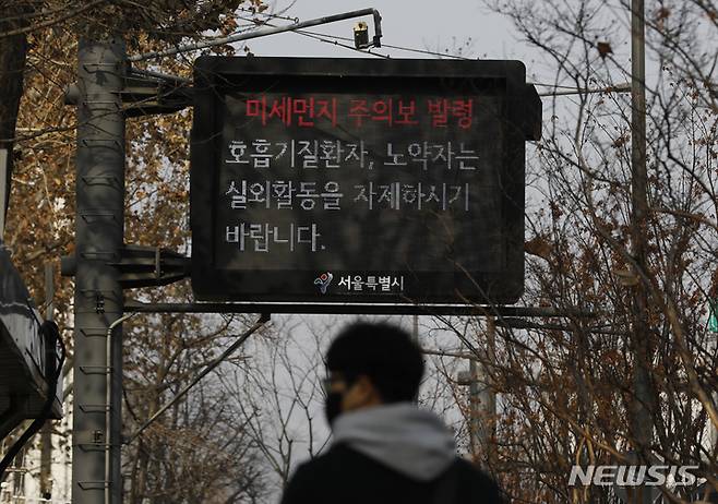 [서울=뉴시스] 고승민 기자 = 서울 등 전국 9개 시, 도에 초미세먼지 비상저감조치가 시행된 8일 서울시청 인근 전광판에 미세먼지 주의보가 표출되고 있다. 2023.01.08. kkssmm99@newsis.com