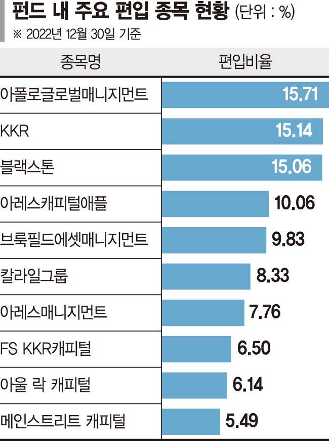 주요 편입종목으로는 아폴로글로벌매니지먼트(15.71%), KKR (15.14%), 블랙스톤(15.06%), 아레스캐피털(10.06%) 등이 있다.
