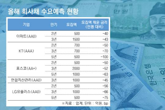 실제 지난 4일 진행된 KT(030200) 회사채 수요예측에서는 5년 만기는 발행예정액 500억원을 민평 금리 대비 -100bp에서 모두 채웠다. 2년물과 3년물도 각각 50bp, 70bp 낮은 수준에서 마감됐따.