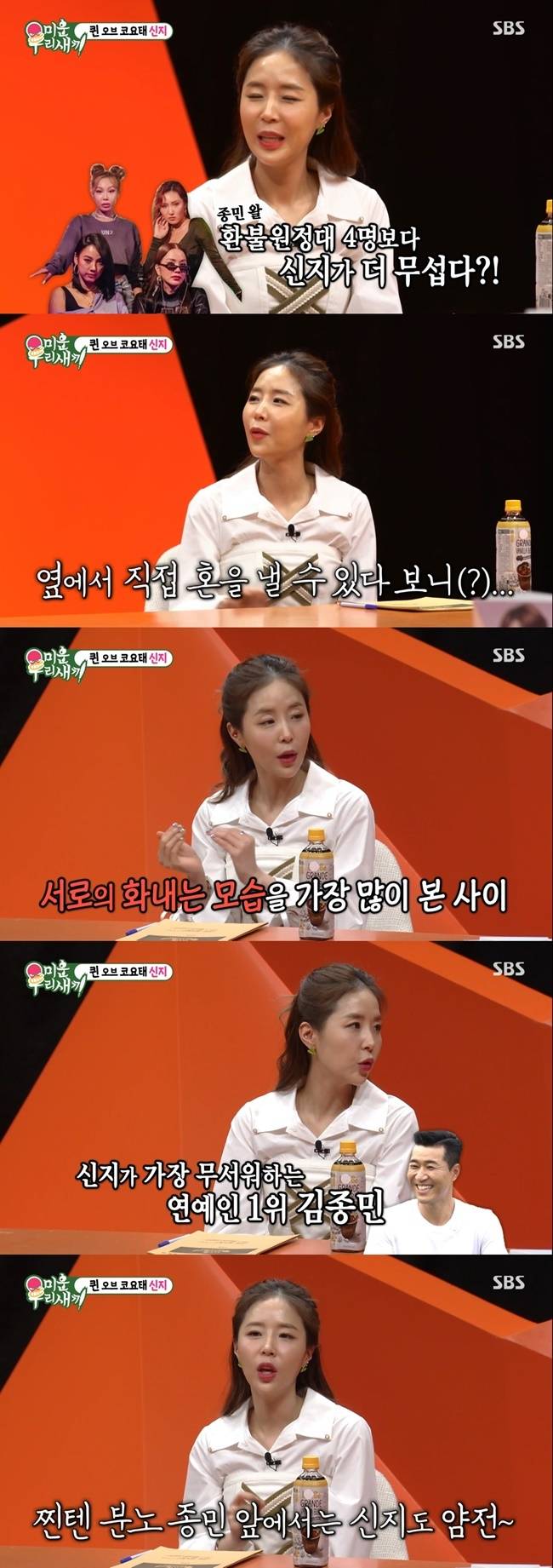 김종민은 환불원정대 화사, 이효리, 엄정화, 제시보다 신지가 더 무섭다고 밝힌 바 있다.