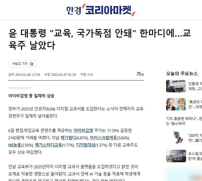 다음날, 주식시장이 바로 반응했습니다. <한국경제>는 <윤 대통령 "교육, 국가독점 안돼" 한마디에...교육주 날았다>라고 보도했습니다. '아이비김영 등 일제히 상승' 부제의 기사에서 아이비김영 주가는 17.39% 급등했고, 메가엠디 주가는 6.81%, 아이스크림에듀 주가는 3.66%, NE능률 주가는 2.56% 등 다른 교육주 또한 상승 마감했다고 전합니다.