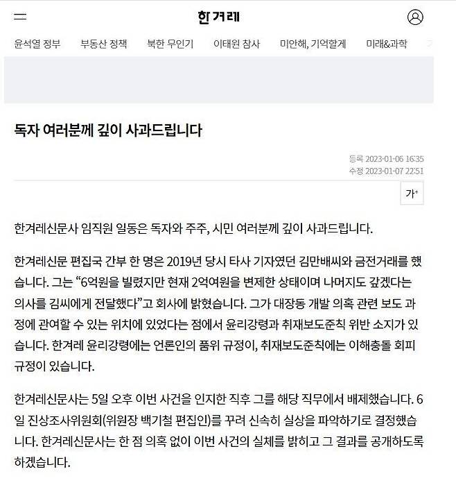 한겨레는 편집국 간부인 A씨가 2019년 당시 타사 기자였던 김만배씨와 금전 거래를 한 것으로 드러났다며 A씨를 직무에서 배제하고 6일 홈페이지에 공개 사과문을 게시했다.