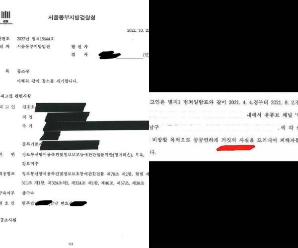 김다예는 9일 공소장도 공개했다. 공소장에 ‘31회에 걸쳐 비방할 목적으로 공공연하게 거짓의 사실을 드러내어 피해자들의 명예를 훼손하였다’에서 ‘거짓의 사실’에 빨간줄을 그어 강조했다.