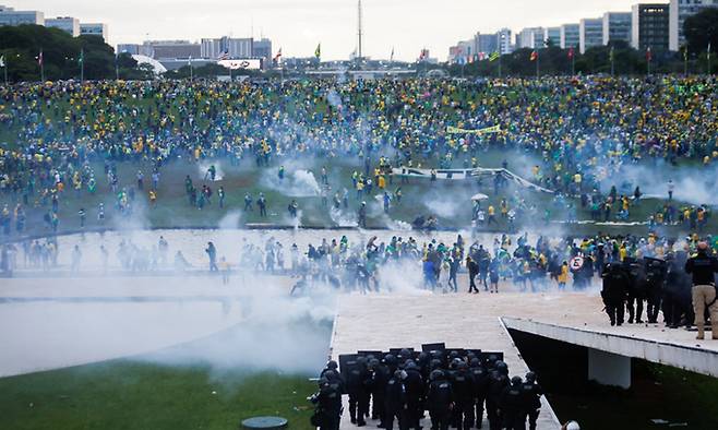 브라질에서 지난해 대통령선거에 패배한 자이르 보우소나루의 지지자들이 8일(현지시간) 의회와 대법원, 대통령궁에 난입해 기물을 부수는 등 폭동을 일으켰다.