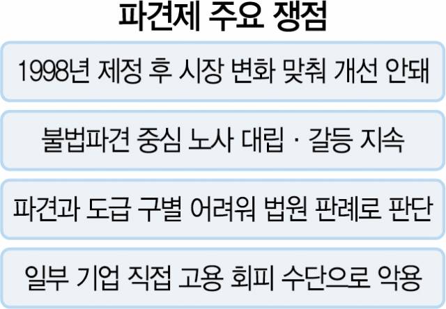 정부가 노동 개혁의 일환으로 파견제도에 메스를 댄다. 파견제 손질은 당사자 간 이해관계가 첨예해 노사정이 논의 테이블 위로 올릴 수 없는 금기처럼 여겨졌다. 하지만 과거 제도를 그대로 두다 보니 근로자 보호 사각지대가 발생하고 적대적 노사 관계를 방치한다는 비판도 이어졌다.