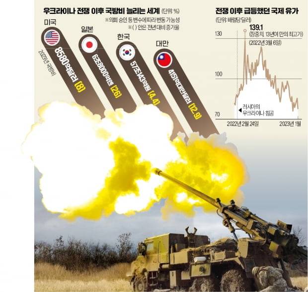 미국의 2023회계연도(지난해 10월~올해 9월) 국방예산은 8580억달러(약 1090조원)로 전년보다 8% 늘었다. 일본은 2023회계연도(올 4월~2024년 3월) 방위비를 전년보다 26% 증액한 6조8000억엔(약 65조원)으로 편성했다. 사상 최대 규모다. 일본은 국내총생산(GDP)에서 방위비가 차지하는 비중을 2027회계연도엔 현재의 두 배인 2%로 늘리기로 했다. 그동안 북대서양조약기구(NATO)가 제시한 국방비 목표치(GDP의 2%)를 달성하지 않았던 회원국들도 증액을 적극 검토 중이다. 한국은 올해 국방비를 지난해보다 4.4% 늘린 57조143억원으로 잡았다.