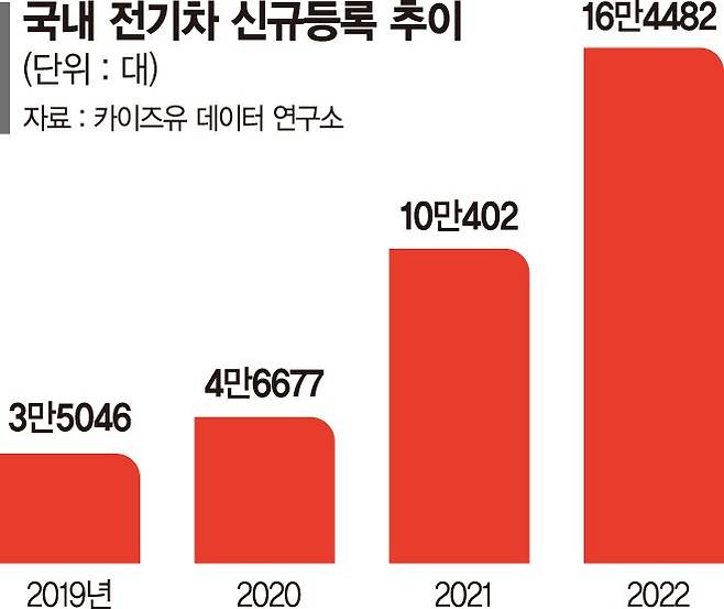 9일 관련 업계와 카이즈유 데이터 연구소 집계를 보면 작년 국산 및 수입 전기차의 연간 내수 판매량은 16만4482대를 기록했다. 2021년(10만402대)과 비교하면 64% 급증한 실적이다.