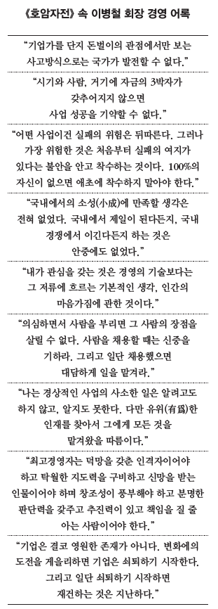 한편 《호암자전》은 1986년 초판 발간 후 한동안 삼성그룹사 임직원들의 필독서로 자리매김했다. 승진하려면 이 책을 의무적으로 읽고 독후감을 써내야 했던 기간도 있었다. 삼성전자의 한 간부급 직원은 "지금은 그런(독후감 제출) 제도가 없고 심지어 이병철 회장이 창업자인지 모르는 젊은 직원도 있다"며 "2대 이건희 회장 별세 이후론 삼성 내에서 오너십이나 기업가 정신을 좀처럼 찾기 어렵다. 책임경영, 인재 제일주의 등 회사 고유의 색깔도 크게 옅어진 듯하다"고 했다.