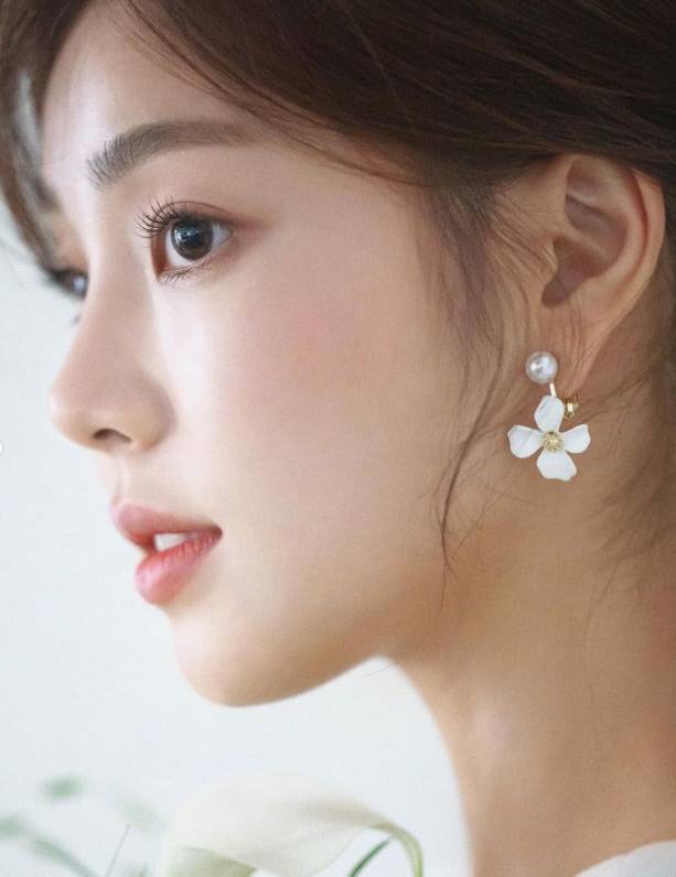 풍성한 시스루 소매주름이 인상적인 러블리한 오프숄더 화이트 드레스에 작은 꽃모양 이어링으로 사랑스런 분위기를 풍긴다.
