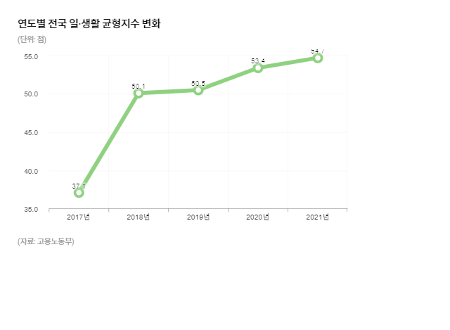 고용노동부가 11일 공개한 '2021년 기준 지역별 일·생활 균형 지수'에 따르면, 2021년 전국 평균 일·생활 균형 지수는 전년 대비 1.3점 높은 54.7점이었다.