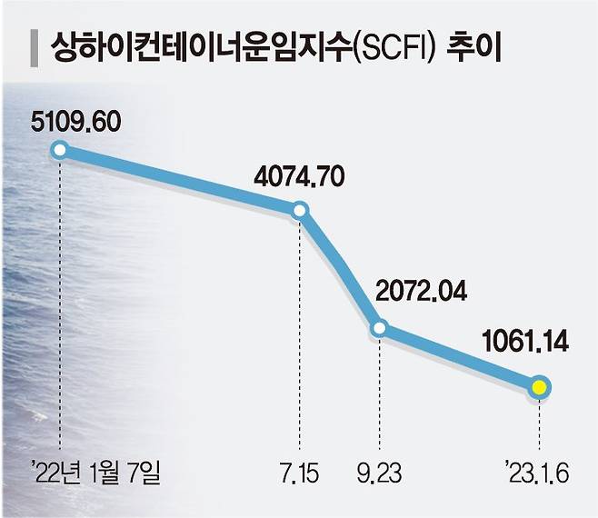 컨테이너 운송 15개 항로의 운임을 종합한 SCFI는 지난 6일 기준 1061.14로 지난해 같은 기간 5109.6에 비해 5분의 1 토막이 났다. 업계는 고금리와 고물가, 경기침체에 따른 물동량 감소가 해운업황에 본격 반영될 것으로 보고 있다.