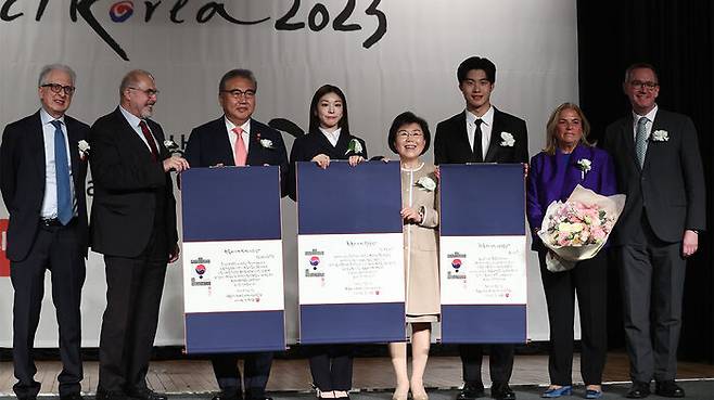 김연아는 서울 강남구 인터컨티넨탈서울 코엑스호텔에서 열린 '한국이미지상 2023' 시상식에서 한국 이미지 제고에 지속해서 공헌한 인물에게 주어지는 주춧돌상을 받았습니다.