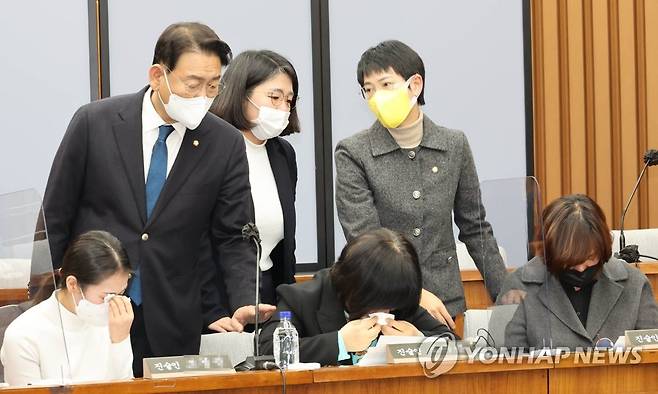 (서울=연합뉴스) 백승렬 기자 = 12일 오후 국회에서 열린 용산 이태원 참사 진상규명과 재발방지를 위한 국정조사특별위원회 공청회에서 더불어민주당 김교흥·기본소득당 용혜인 의원과 정의당 장혜영 의원이 회의가 정회되자 유가족을 위로하고 있다. 2023.1.12