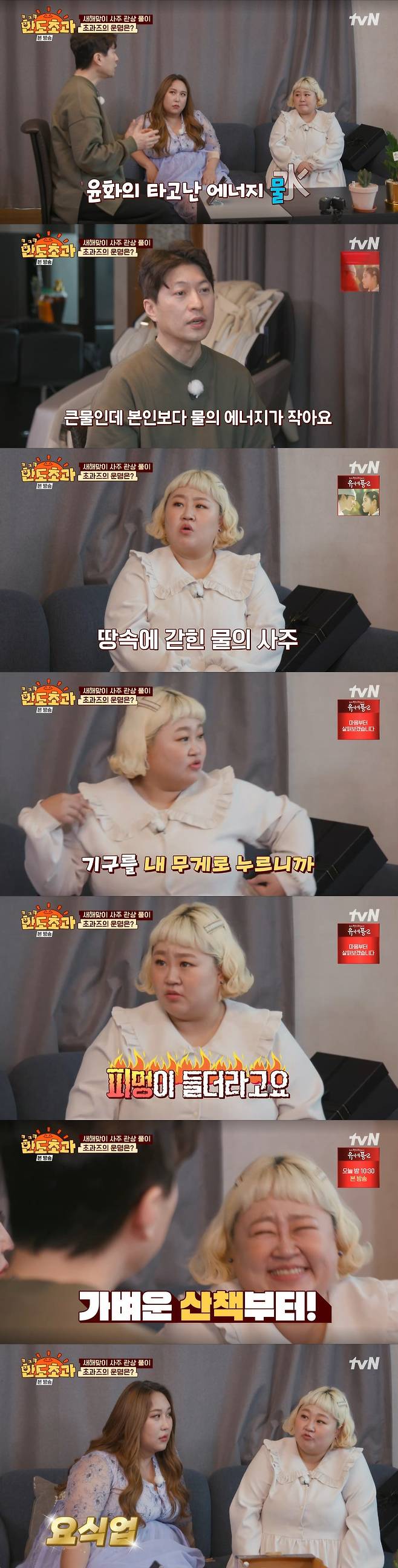 박성준은 "홍윤화 씨는 물의 에너지를 타고났다. 큰물인데 본인보다 물의 에너지가 작다. 그래서 땅에 갇혀있어서 스트레스가 많은 사람이다"라며 요가와 필라테스를 추천했다.