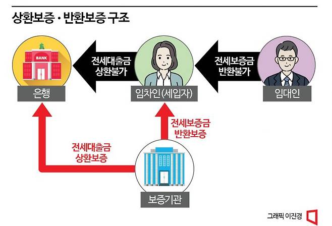 반환보증은 임대인을 대신해 세입자에게 전세보증금을 돌려주는 구조다. 세입자는 돌려받은 보증금으로 대출금을 갚거나 이사를 할 수도 있게 된다. 보다 전세보증금을 확실하게 돌려받을 수 있어 안전하기 때문에 대체로 반환보증이 더욱 권장되고 있다.