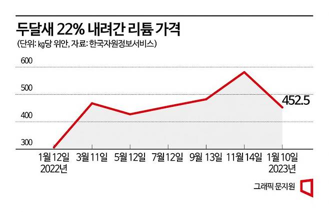 지난해 러시아와 우크라이나 전쟁 이후 원자재 가격의 급등과 전기차 배터리 수요 증가에 따라 리튬 가격은 한때 t당 1억원을 넘었다.
