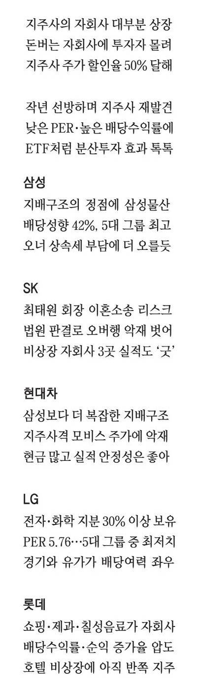 증권사들은 지주사 주가가 설명이 안 되다 보니 목표주가를 계산할 때 순자산가치(NAV) 대비 40~50%에 달하는 할인율을 적용해왔다. 작년부터 이런 공식이 깨지고 있다. 코스피가 2022년 25% 하락한 가운데 지주사 주가가 이것보다 덜 빠지며 선방한 것이다. 지주사들이 워낙 저평가된 데다 다양한 업종의 자회사들을 거느린 상장지수펀드(ETF) 성격으로 투자자들에게 분산투자 효과를 안겨줬다.