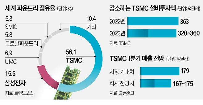 메모리반도체에 이어 파운드리(반도체 수탁생산) 시장까지 빠르게 냉각되고 있다. 대만 UMC 등 세계 3~5위권 파운드리 업체의 실적이 눈에 띄게 둔화하고 있는 가운데 세계 1위 TSMC마저 올해 설비투자를 전년 대비 최대 12% 줄이기로 했다. 삼성전자의 고민도 깊어지고 있다. ‘중장기 투자는 유지하지만 신속·탄력적으로 수요에 대응한다’는 방침에 따라 올해 파운드리 설비투자가 전년 대비 감소할 것이란 전망이 나온다.