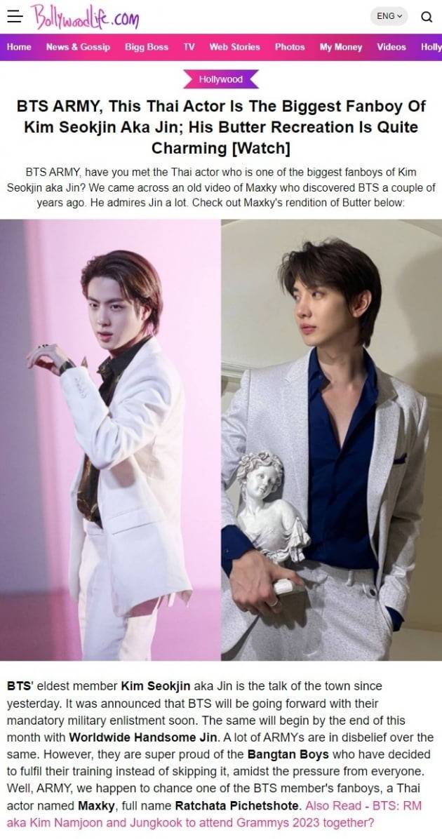 인도 연예 매체 발리우드 라이프(Bollywood Life)는 최근 태국 배우 맥스키(Maxky, Ratchata Pichetshote)를 진의 열렬한 팬보이라며 소개했다.