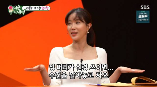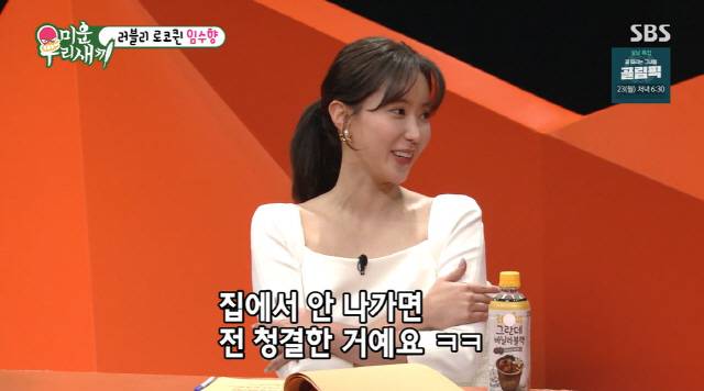 임수향은 "전 집에만 있으면 청결한 거다. 정 머리가 신경 쓰이면 머리에 수건을 깐다. 몸은 좀 씻는데 머리는 머릿결에 안 좋다"라고 말했다.