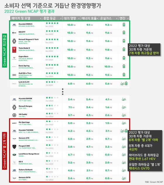 GV70을 비롯, 하위권 전체 8개 차종의 절반이 국산차였습니다. 제네시스 G70 슈팅브레이크(2.2 디젤), 기아 스포티지(1.6 가솔린), 현대 투싼(1.6 하이브리드)은 각각 26위, 25위, 24위에 이름을 올렸죠. 하이브리드 자동차 가운데, 별을 두 개밖에 받지 못한 자동차는 투싼이 유일했습니다.