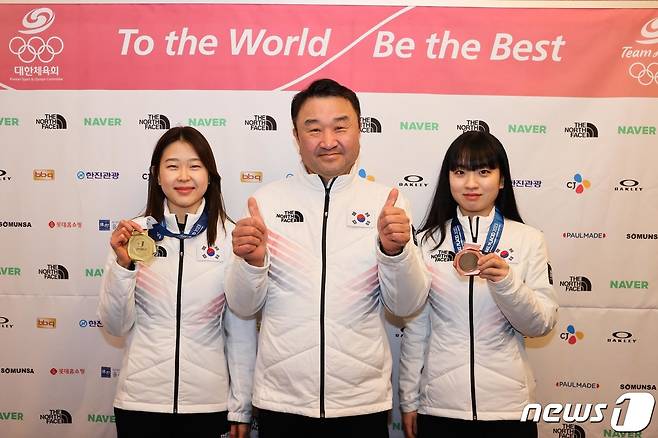 (서울=뉴스1) = 16일(한국시간) 미국 뉴욕주 레이크플래시드 올림픽 센터 스피드스케이팅 오벌에서 열린 제31회 동계유니버시아드 스피드스케이팅 여자 1000m에서 금메달을 딴 김민선(고려대·왼쪽)과 동메달을 딴 박채은(한국체대·오른쪽)이 김영도 단장과 기념촬영을 하고 있다.