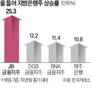 16일 JB금융지주 주가는 2.70% 오른 9890원에 거래를 마쳤다. 지난해 말과 비교하면 25.3% 급등했다. 같은 기간 코스피지수 상승률(5.24%)은 물론 주요 금융지주사·은행 주가를 종합한 KRX은행지수 상승률(21.4%)을 앞질렀다. 외국인은 지난달 21일부터 하루도 빼놓지 않고 JB금융을 순매수하고 있다.