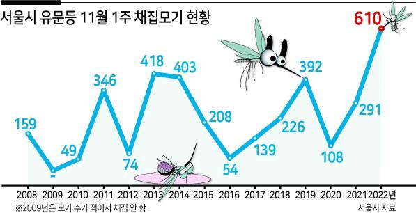 반면 지난해 11월 날씨는 평년 수준을 크게 웃돌면서 '가을 모기'가 기승을 부렸다 (11월 10일자 입동 지났는데 '왱~'...철없는 모기의 공습). 지난해 11월에는 최고기온이 20도를 넘는 날이 11일간 지속됐다.