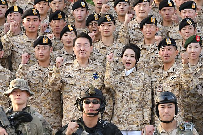 | ▲ 아랍에미리트(UAE)를 국빈 방문 중인 윤석열 대통령과 김건희 여사가 15일(현지시간) 아부다비에 파병 중인 아크부대를 방문, 부대원들과 기념촬영을 하고 있다. |