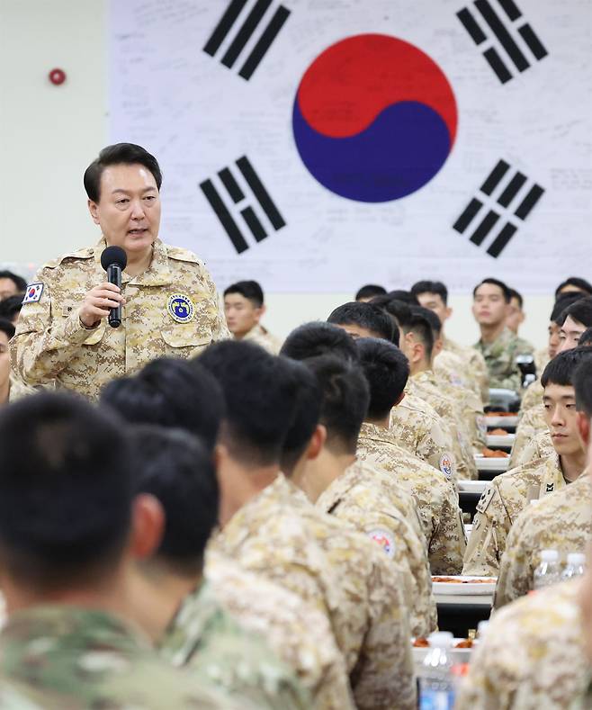 | ▲ 아크부대 찾은 윤석열 대통령 아랍에미리트(UAE)를 국빈 방문 중인 윤석열 대통령이 15일(현지시간) 현지에 파병중인 아크부대를 방문, UAE측 관계자들과 인사를 나누고 있다. |