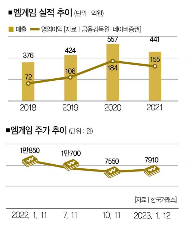 1만3500원(2022년 4월 7일)으로 지난해 최고가를 기록했던 주가가 현재(1월 9일) 7900원으로 '반토막' 난 건 좋지 않은 시그널이지만 반등할 여지는 있다. 엠게임은 2022년 3분기(누적) 매출 441억원, 영업이익 155억원, 당기순이익 137억원을 기록하며 2021년 같은 기간 실적을 갈아치웠다.