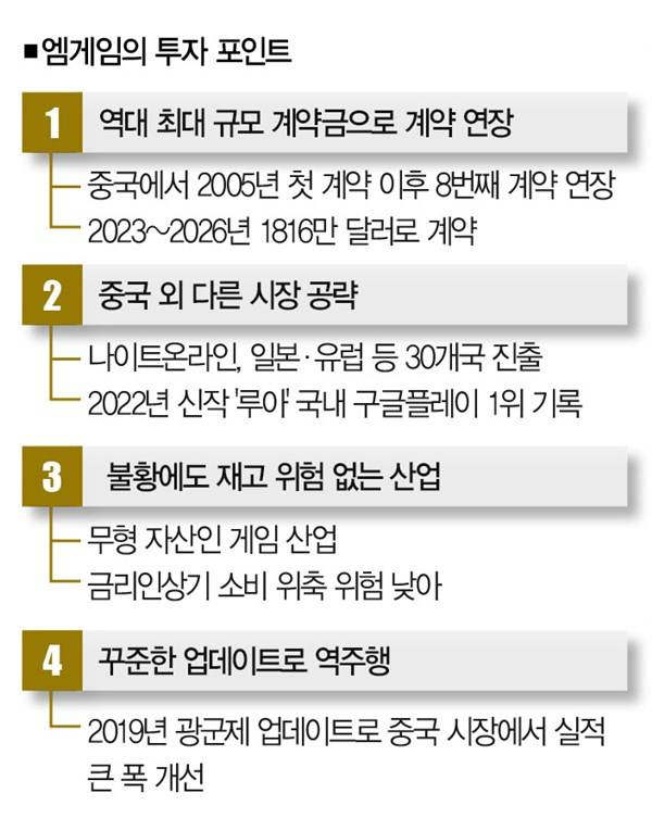 고물가와 고금리 여파로 세계 경제가 뒷걸음질하고 있다. 경기침체가 본격화할 거란 전망도 곳곳에서 흘러나온다. 국가와 산업을 불문하고 비관론이 쏟아지고 있지만, 높은 성장성이 점쳐지는 분야도 있다. 중국 게임 시장이다. 중국 정부가 봉쇄했던 문을 열어젖힌 데다, 게임 산업 자체가 경기의 영향을 덜 받기 때문이다. 중국 게임시장에서 열혈강호 등 '장기흥행작'을 론칭해 온 엠게임에 투자업계의 시선이 쏠리는 이유다.