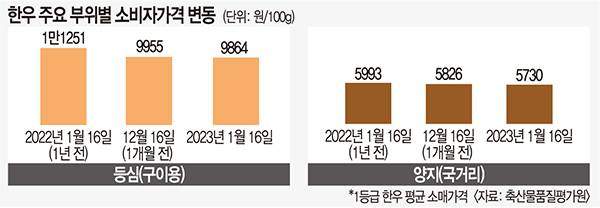 소비자에겐 피부에 와닿지 않지만, 한우 도매가격은 실제로 폭락했다. 17일 축산물품질평가원에 따르면 16일 기준으로 6~7개월 암송아지 1마리의 산지 경매가격은 197만6000원, 숫송아지는 290만4000원이다. 1년 전보다 각각 32.7%, 26.2%나 떨어졌다. 1등급 한우의 등심 도매가격은 16일 기준으로 ㎏당 5만5642원이다. 약 1년 전인 지난해 1월 17일 6만7940원과 비교하면 18.1% 내렸다.
